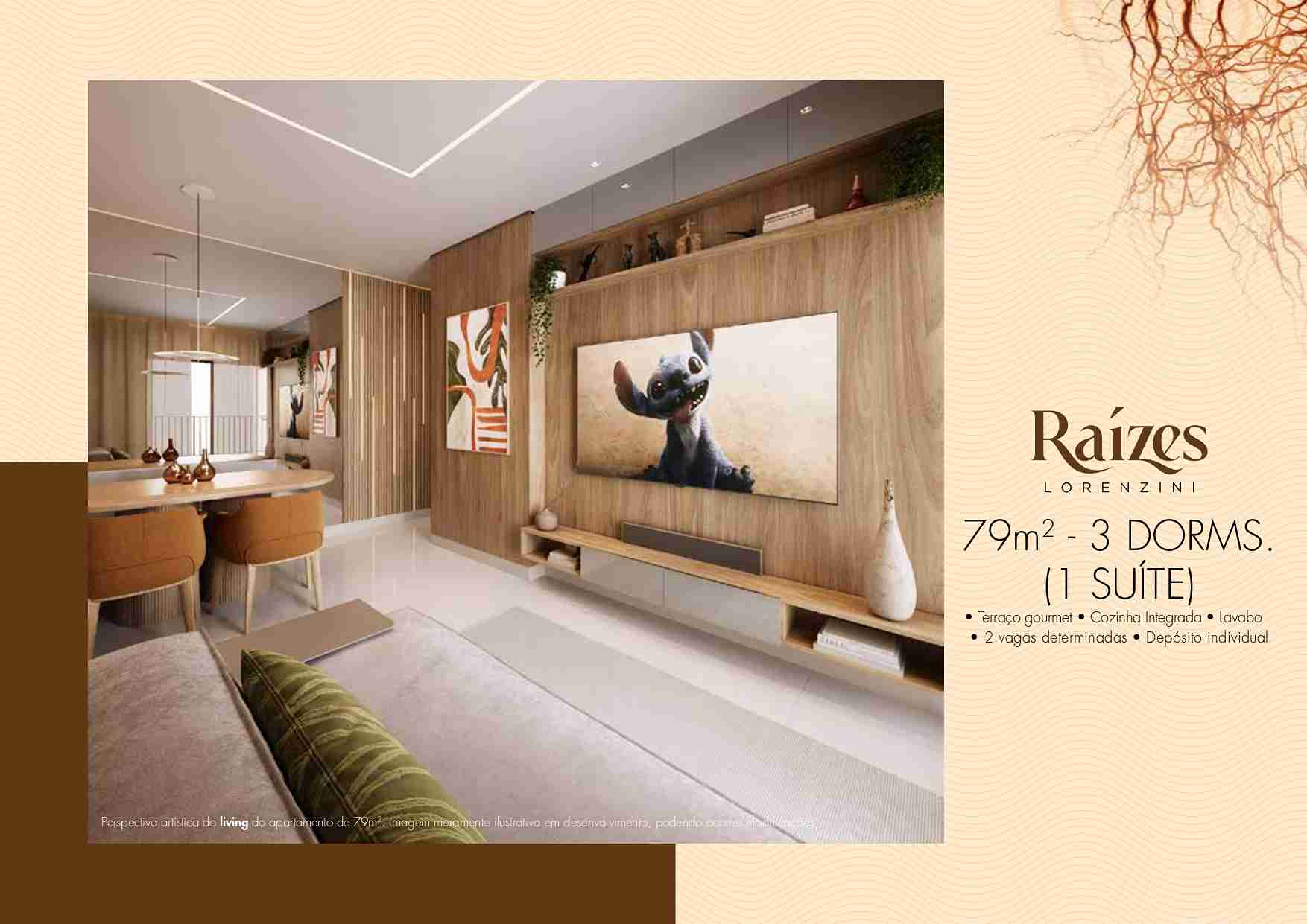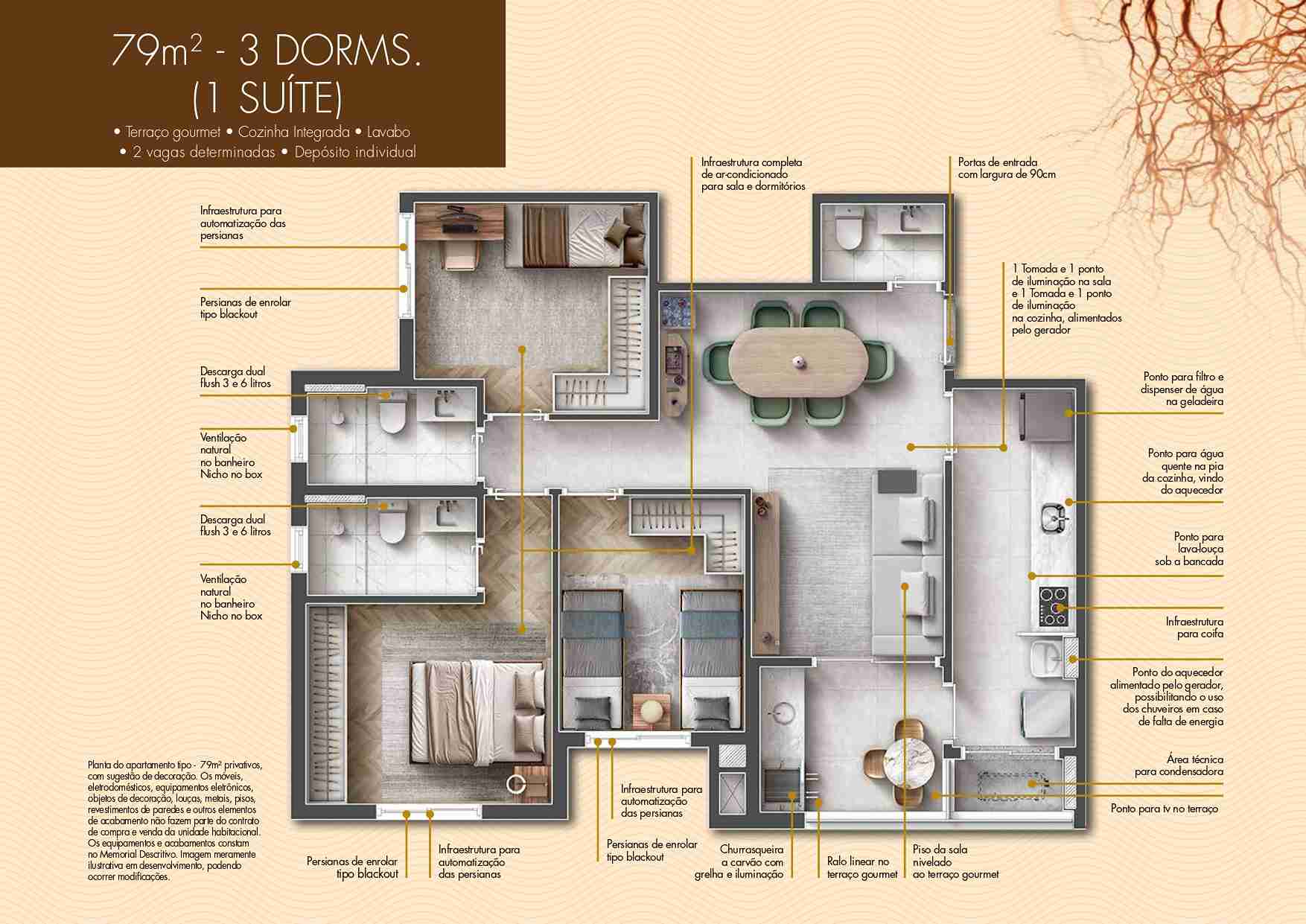 79,95 m² – 3 dormitórios (1 suíte) + lavabo, terraço gourmet com opção de living ampliado ou 2 suítes, 2 vagas determinadas e depósito privativo