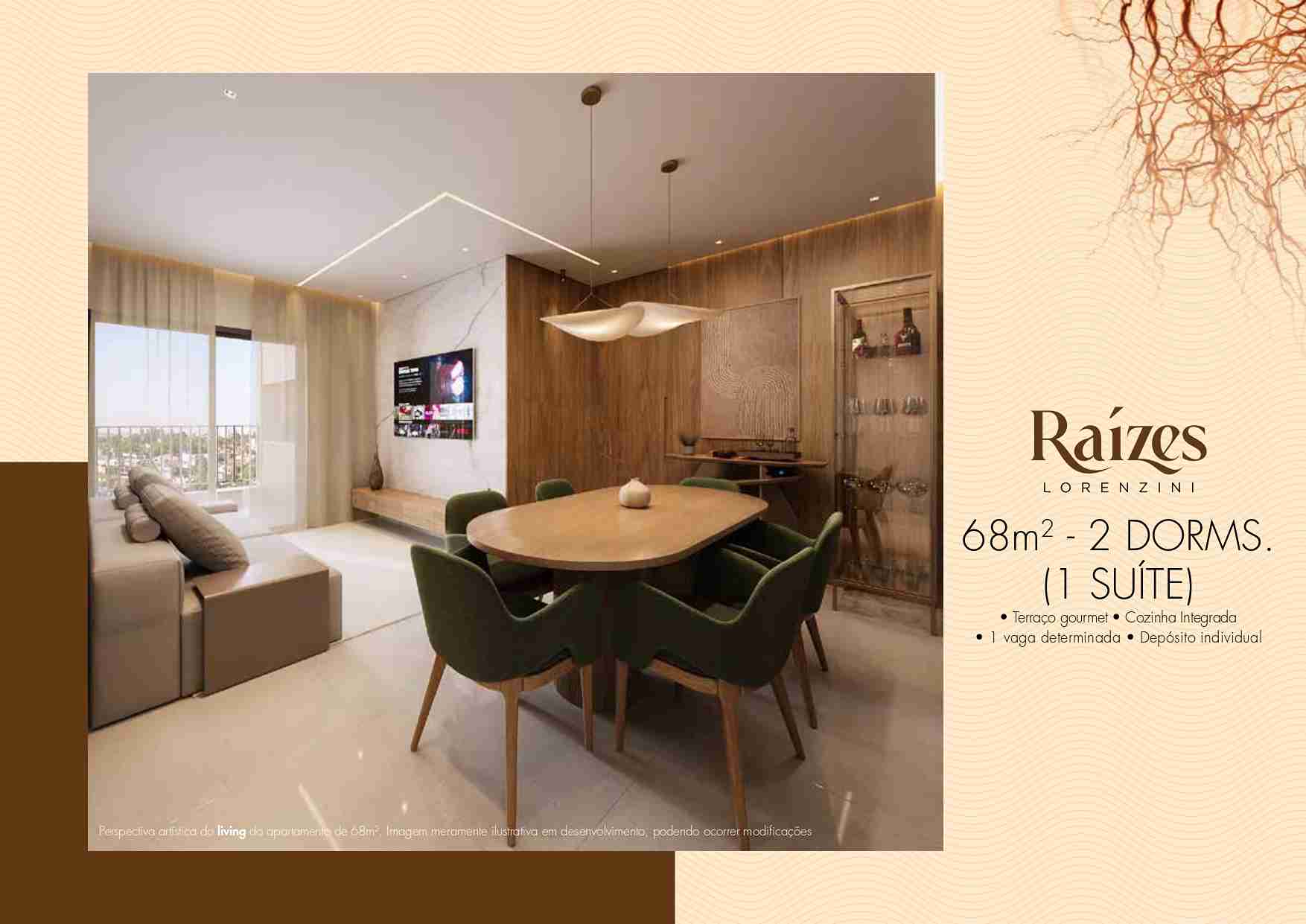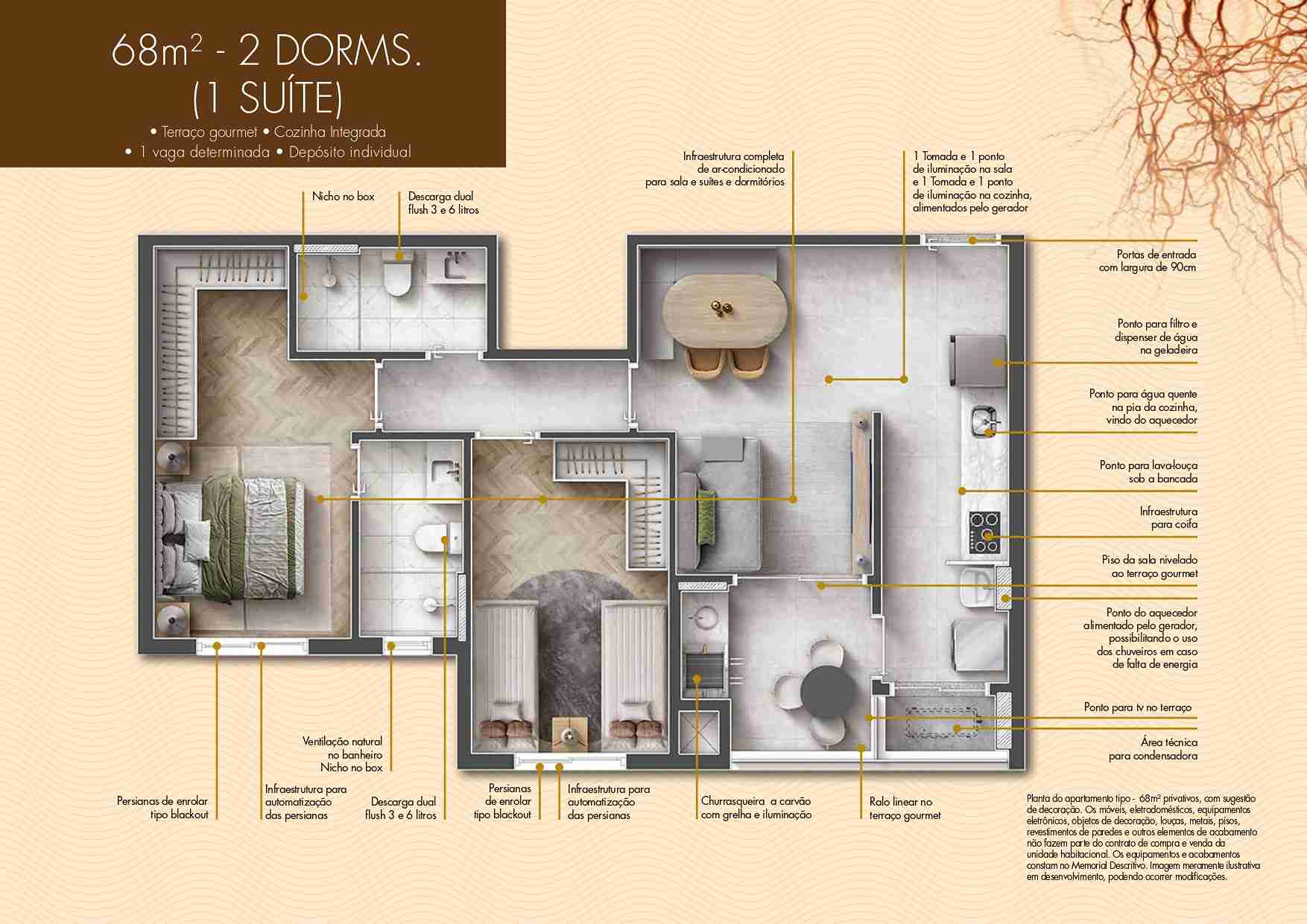 68,38 m² – 2 dormitórios (1 suíte), terraço gourmet, 1 vaga determinada e depósito privativo